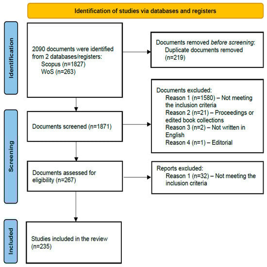 The detailed PRISMA flowchart is presented in Figure 1 and as it can be seen, 1827 documents from Scopus and 263 from WoS were identified. Hence, the document collection initially contained 2090 documents and after removing the duplicates identified (n = 219), a total of 1871 documents remained which were further examined for eligibility based on their title and abstract. To identify the duplicate documents, the title and DOI of the documents were examined. Additionally, the average citations between those reported in Scopus and WoS was calculated for the duplicate documents. From the remaining 1871 documents, 1580 were removed as they were out of scope and did not meet the inclusion criterion, 21 were removed as they were proceedings or edited book collections, 2 were removed as they were not written in English, and 1 was removed as it was an Editorial. Therefore, 267 documents remained and they were assessed for eligibility based on their full text. After examining the full text of the documents, a total of 32 documents were deemed out of scope since they did not meet the inclusion criterion and as a result, the document collection examined in this study consists of 235 documents.