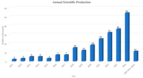 Based on Figure 2, an increase in the number of published studies is observed from 2018 onwards. Hence, it can be inferred that from 2011 to 2017 (n = 32, 13.6%) it was the period in which the interest in this field started to appear while from 2018 onwards the field started to mature. More studies were published in 2023 (n = 36, 15.3%), 2022 (n = 32, 13.6%), and 2021 (n = 25, 10.6%) with the year 2024 showcasing a significant increase in published documents (n = 54, 23.0%). However, in the first six months of 2025 only 11 related documents were published (4.7%) which indicates a potential decrease in the number of published documents. Based on the mean total citations received per document which is presented in Table 3, the documents published in 2012 (MeanTCperDoc = 29.67), 2017 (MeanTCperDoc = 27.43), 2013 (MeanTCperDoc = 23.8) and 2019 (MeanTCperDoc = 23.75) received the most citations on average. However, the documents published in 2020 (MeanTCperDoc = 16.06), 2021 (MeanTCperDoc = 15.72), and 2015 (MeanTCperDoc = 14.33) have also showcased a relatively high number of average citations received. This fact further validates the lack of a definitive breakthrough time period for this field as its foundations are still being actively examined. However, it should be noted that this metric does not directly relate to the impact that all documents published in a year have as a whole. However, the related outcomes are expected to change as the field further advances.