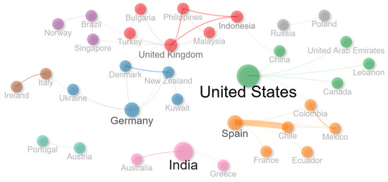 Regarding the intra-country (SCP) collaboration and inter-country (MCP) collaboration among countries, the United States (SCP = 33) and India (SCP = 28) had the highest SCP among the countries followed by Germany (SCP = 19), Spain (SCP = 11), China, Indonesia, and Malaysia which all had an SCP of 10. Chile had the highest MCP (MCP = 5), followed by India (MCP = 3), the United States, China, Indonesia, Mexico, and Italy which all had an MCP of 2. When considering the international co-authorships rate being 13.62%, 9 clusters of collaborators arose which are presented in Figure 3.