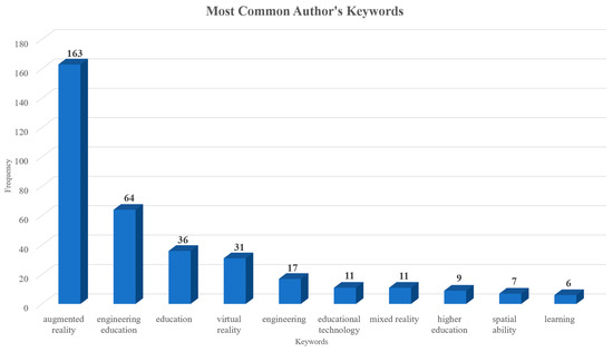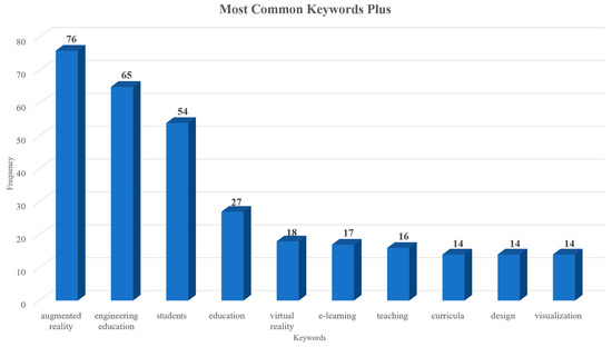 Given the multidisciplinary nature of engineering education and its multiple applications, in addition to the bibliometric data analysis, the keywords of the documents were used along with the text and abstract of the documents to carry out topic analysis. For the keywords, both keywords plus and author keywords were used. Figure 4 and Figure 5 present the most widely used keywords of each category. Specifically, the most frequently used keyword plus were “augmented reality”, “engineering education”, “students”, “education”, “virtual reality”, “e-learning”, “teaching”, “curricula”, “design”, and “visualization”. The most commonly used author keywords were “augmented reality”, “engineering education”, “education”, “virtual reality”, “engineering”, “educational technology”, “mixed reality”, “higher education”, “spatial ability”, and “learning”.