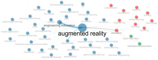 - Blue cluster: 3d, 3d models, active learning, augmented reality, chemical engineering, civil engineering, educational technology, e-learning, engineering drawing, engineering education, experiential learning, extended reality, game-based learning, gamification, immersive learning, immersive technology, Industry 4.0, interactive learning environments, interactive learning, learning environment, mechanical engineering, metaverse, mixed reality, mobile applications, mobile application, motivation, motivational, simulation, skills, spatial ability, system, unity, virtual reality, and vuforia.