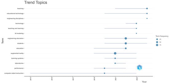 Additionally, to better understand the topics of the collection, a thematic evolution and trend topic analysis was also carried out using Bibliometrix. When examining the thematic evolution of the topic, no profound evidence regarding the directions in which the topic heads for over the years was found. However, based on the related outcomes, it can be stated that there is a transition from emphasizing how augmented reality could be integrated into the curricula, to how it can affect students’ learning motivation, how it can be used effectively for teaching, and how it can be integrated into existing learning systems. Finally, over the past few years, there has been an emphasis on how the information and educational content are visualized and presented to students. However, the trend topic analysis presents a clearer representation of the topics that are mostly examined in recent years as can be seen in Figure 7. Specifically, the initial emphasis on computer-aided instructions shifted more profoundly on augmented reality, education, and learning performance starting from 2019. Thereafter, emphasis has been placed on how augmented reality can be used in teaching and learning, how it affects students in the context of engineering education and how it can be used in conjunction with other learning systems in the broader domain of educational technology. In recent years, there has been an increasing focus on 3D modeling within augmented reality environments, on creating realistic and immersive virtual laboratories, and on the impact that augmented reality has on various engineering disciplines. These outcomes are in line with key topics identified from the topic analysis. However, it is worth mentioning that since the topic analysis also included the document title and abstract, more topics with more specific details were identified. Particularly, when considering the topics identified, it is important to highlight the cohesion among the topics. For example, immersive technologies are closely related to gamified learning and gameful approaches and their combination can influence teaching and learning activities. Additionally, in the context of engineering education, developing and using virtual and remote laboratories, which can also integrate gamification aspects, is widely examined. Given the nature of augmented reality and other immersive technologies, their ability to provide realistic and interactive models and visualizations as well as to create opportunities for interactive, collaborative, and social learning is highly regarded. However, these environments require effective student-centered design approaches to be followed to foster students’ motivation and participation. Nonetheless, augmented reality aligns with existing learning theories (e.g., experiential learning, constructivism, etc.) and can create effective virtual learning environments which enrich existing engineering educational practices. Hence, the topics identified from the topic analysis, although distinct in nature, they are highly interrelated with one another.