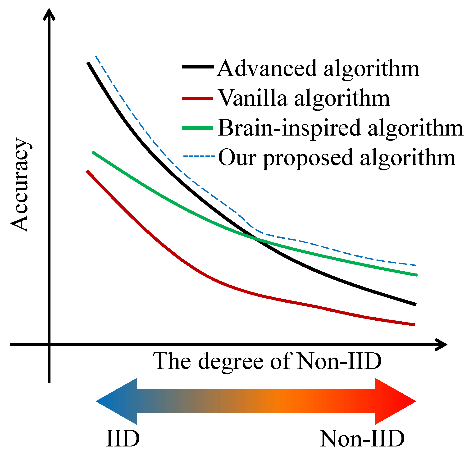 In this paper, we propose an algorithm that jointly incorporates a brain-inspired approach and regularization to tackle the Non-IID problem in FL. The proposed method is expected to achieve performance comparable to advanced approaches such as FedProx under IID settings, and to brain-inspired approaches such as FedNACA under Non-IID settings, as illustrated by the blue dashed line in Figure 1.