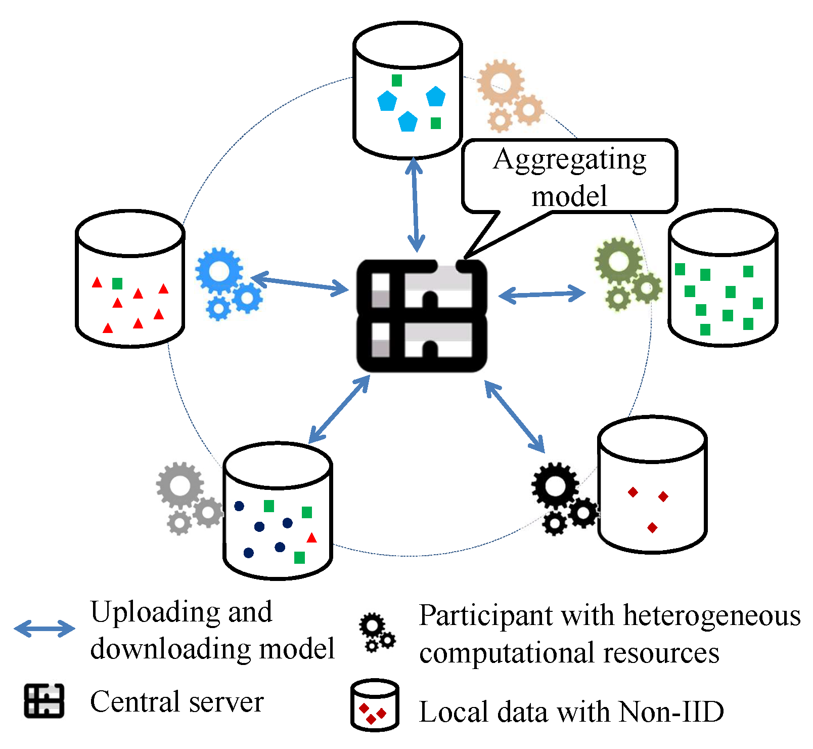 Figure 2. Architecture of federated learning. Different colors and shapes represent different distribution of data.
