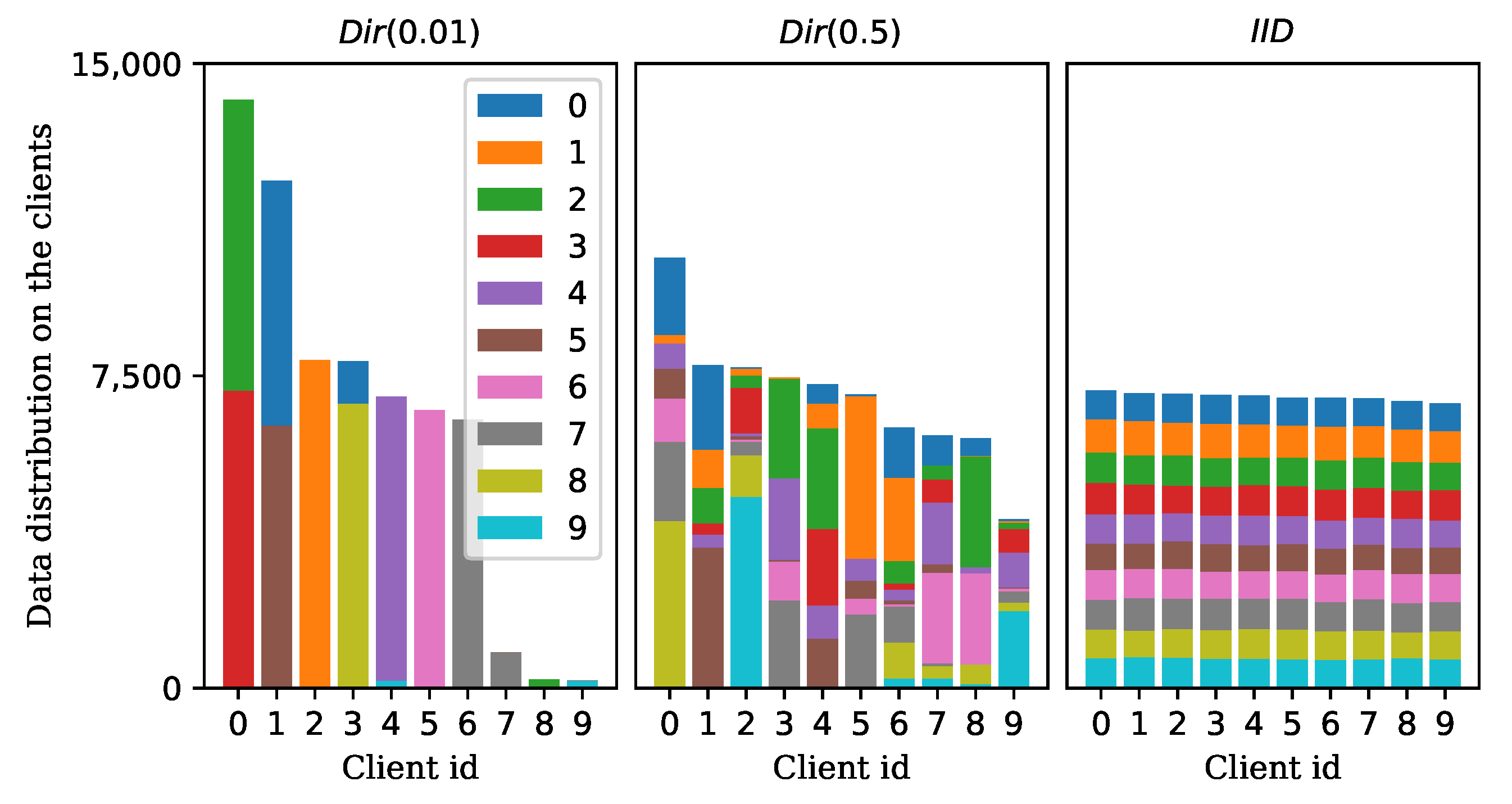 We assume that the class quantities on each client follow a Dirichlet distribution D i r ( β ) , where β is an r-dimensional vector corresponding to the number of classes. All components of β are assumed equal, β 1 = β 2 = = β r = β , indicating an isotropic Dirichlet prior. The size of each local dataset is sampled from a uniform distribution, | D i | U ( | D | N , λ ) , where 0 λ | D | N is a variance parameter controlling the degree of Non-IID. The distribution becomes IID when λ = 0 and becomes increasingly Non-IID as λ increases.