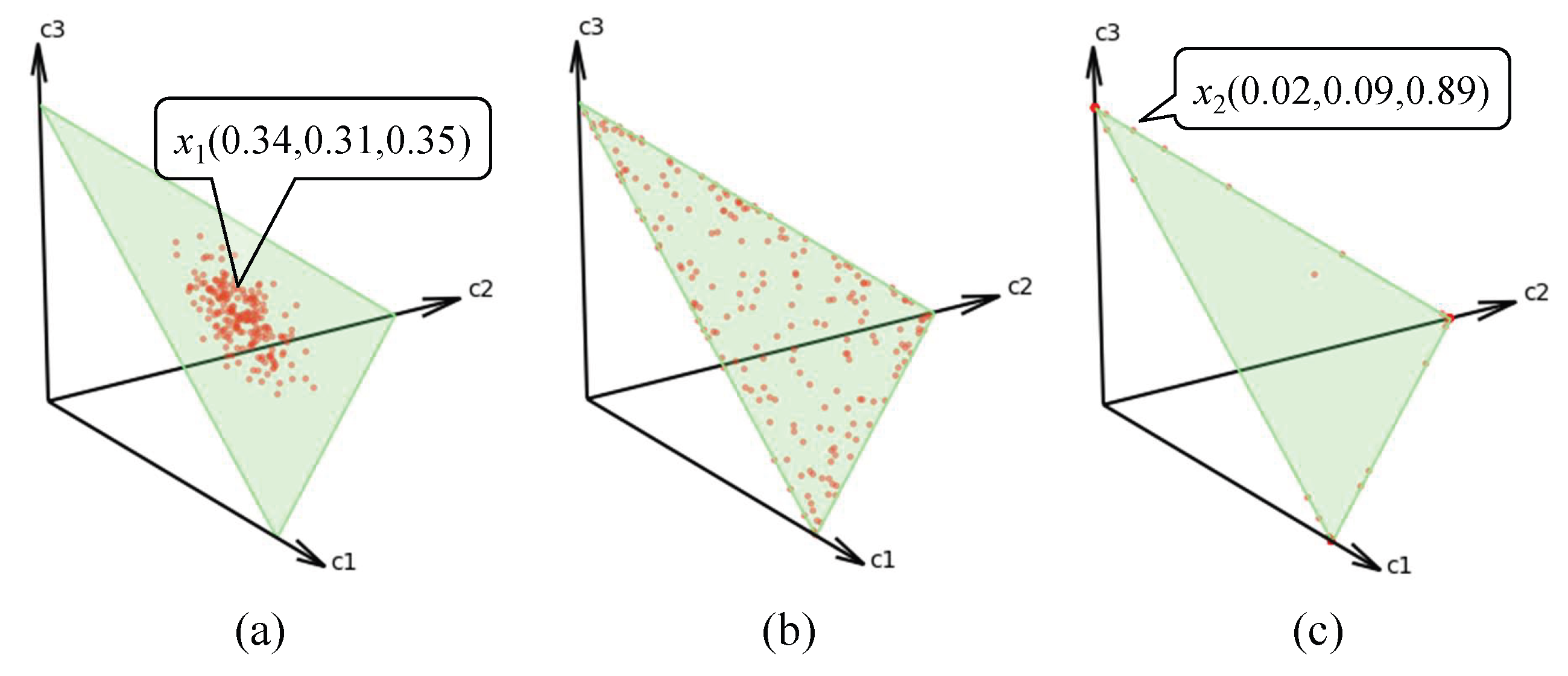 Figure 4. An example of client distribution under different Non-IID settings is shown. The dataset contains three classes labeled c 1 , c 2 , and c 3 . The red dots denote the samples, and their locations represent the ratios of the classes. (a) IID scenario: All clients are located near the center of the triangle. Each coordinate of a sample, e.g., x 1 ( 0.34 , 0.31 , 0.35 ) , denotes the proportion of each class in the local dataset, with the sum of the values equal to 1. This indicates that each local dataset contains samples from all classes in roughly equal proportions. (b) Mild Non-IID scenario: Clients are uniformly distributed across the triangle. Some clients remain near the center, while others are located closer to the edges, reflecting moderate variations in class proportions. (c) Severe Non-IID scenario: All clients are clustered in a small corner of the triangle. For example, x 2 ( 0.02 , 0.09 , 0.89 ) indicates that a sample from class c 3 accounts for 89% of the dataset, leading to a highly imbalanced distribution.