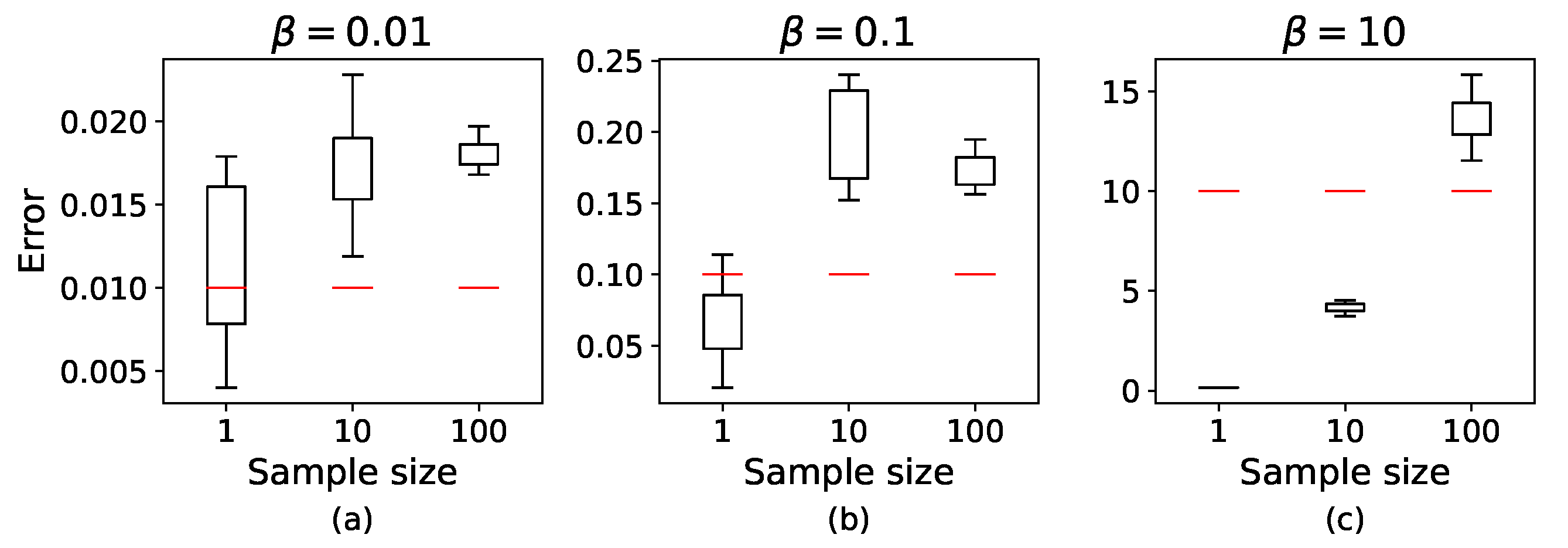 Since the MAP estimate lacks a closed-form solution, the Newton–Raphson method is used to obtain a numerical estimate of β . To evaluate the effectiveness of this numerical solution, we run the program 10 times under each setting. The results are illustrated with error bars in Figure 6. The numerical estimates perform well under Non-IID settings, while noticeable deviations from the true value are observed under IID conditions. This is because the final MAP estimate is influenced by the hyperparameters a , b in the Gamma prior distribution.