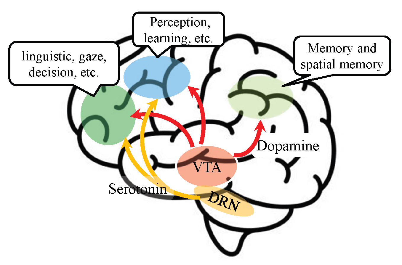 Figure 8. Neuromodulation of local plasticity in the brain. Major neuromodulators, such as dopamine and serotonin, released from the ventral tegmental area (VTA) and the dorsal raphe nucleus (DRN), play essential roles in memory formation and the acquisition of new skills.