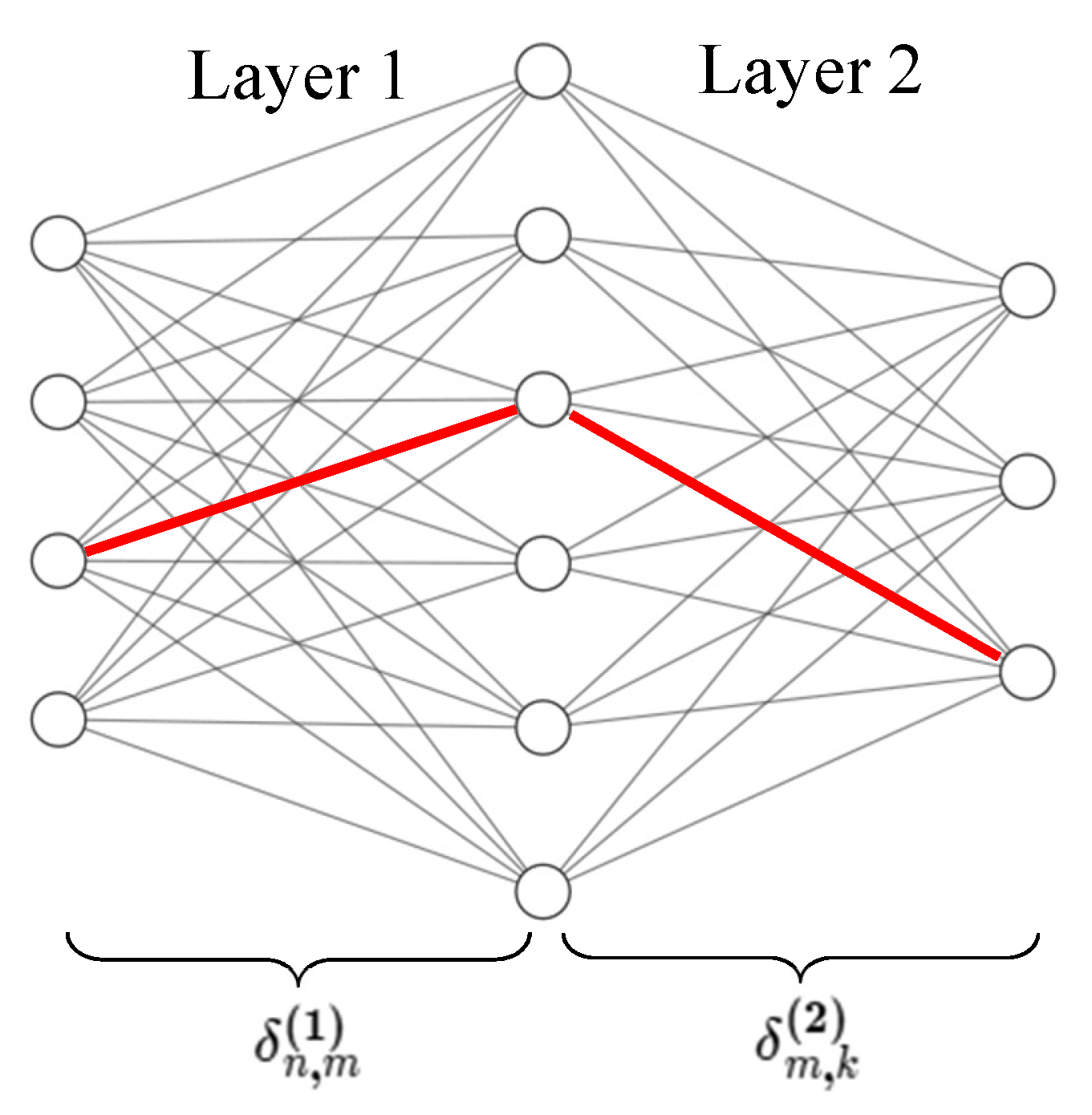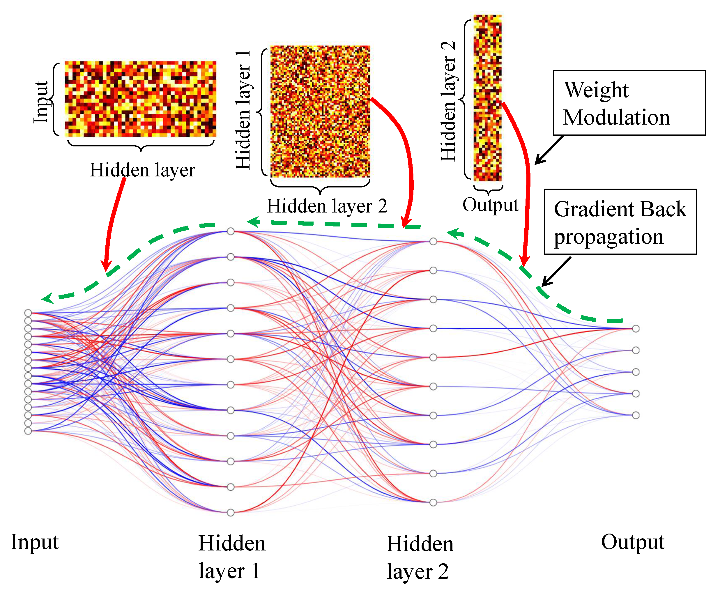 Figure 9. Diagram of the brain-inspired algorithm. Global modulation (red solid line) influences the weight updates during gradient backpropagation (green dashed line) during local update in the client. The red lines denote the positive weight while the blue lines denote the negative weights.