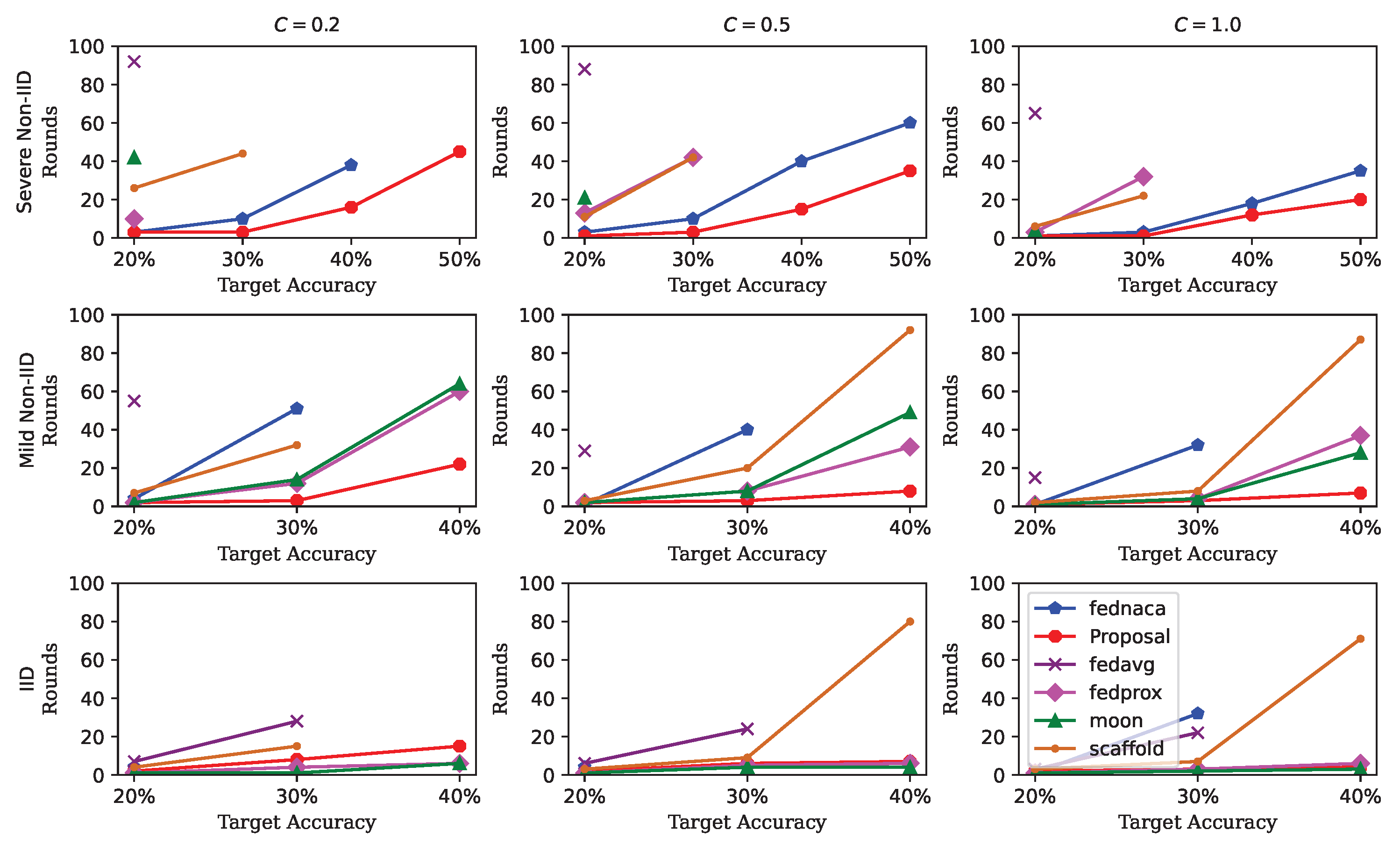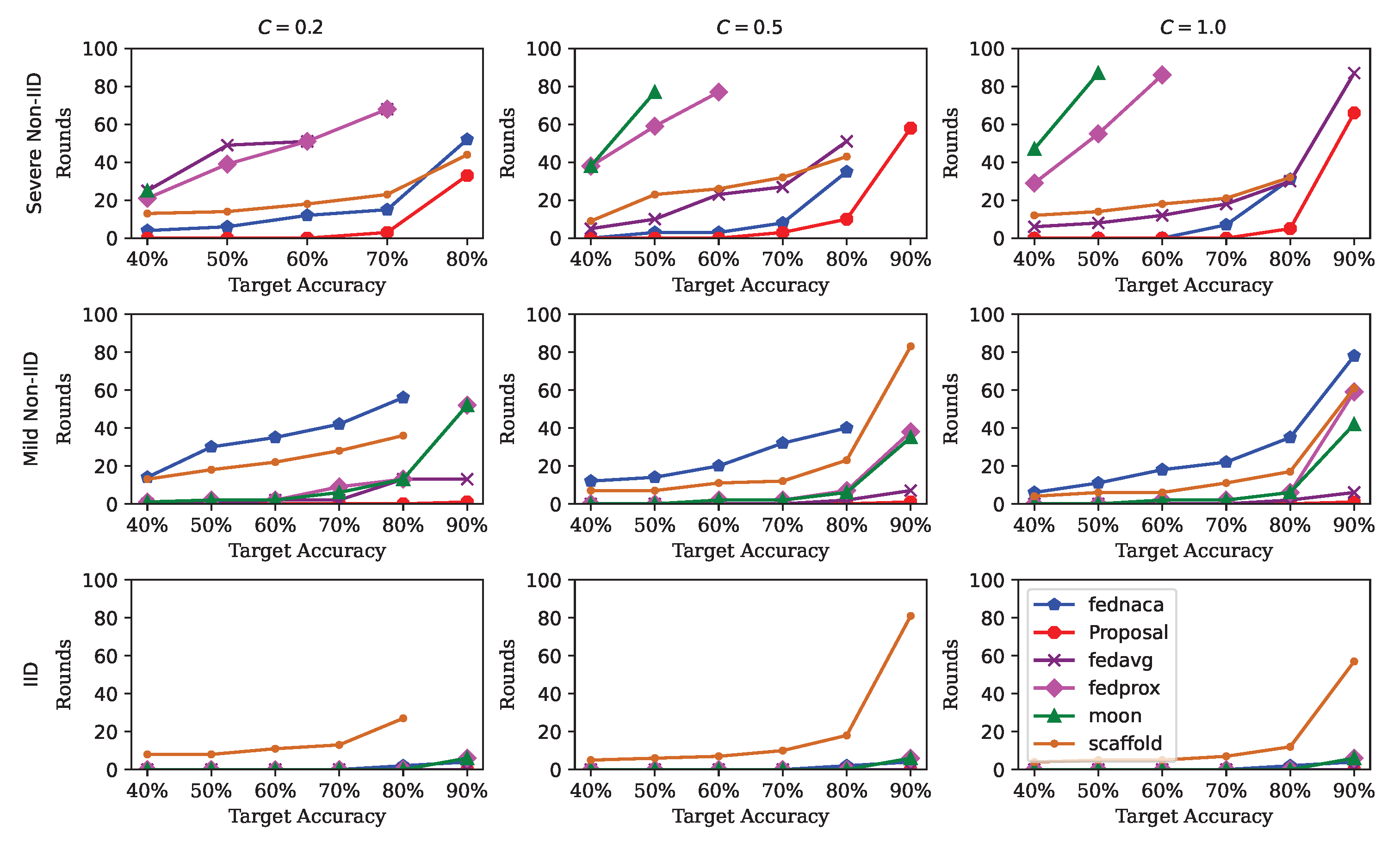 Figure 10. Evaluation results on MNIST under varying degrees of Non-IID and different client sampling ratios are presented. Subplots within the same column correspond to experiments conducted with client sampling ratios C = 0.2 , 0.5 , 1 , while subplots within the same row correspond to settings with different degrees of Non-IID, namely IID, mild Non-IID, and severe Non-IID, respectively.