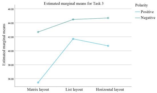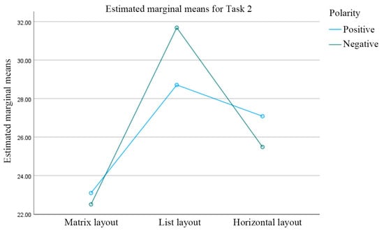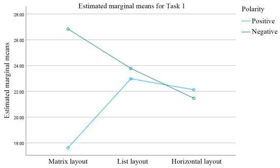 As shown in Table 3, the main effect of information layout on Task 1 completion time was not significant (F(2,54) = 0.401, p = 0.671 > 0.05, η2 = 0.015). However, the main effect of auxiliary instruction display mode was significant (F(1,54) = 4.387, p = 0.041 < 0.05, η2 = 0.075). Completion time was shorter with positive polarity (M = 20.905 s, SD = 6.210) than with negative polarity (M = 24.026 s, SD = 5.846). This suggests that positive polarity facilitates faster capture of single information items. As illustrated in Figure 3, a significant interaction effect was found between information layout and auxiliary instruction display mode on Task 1 completion time (F(2,54) = 4.268, p = 0.019 < 0.05, η2 = 0.136). Simple effects analysis revealed that under the matrix layout, positive polarity (M = 17.615 s, SD = 5.705) led to faster completion times than negative polarity (M = 26.835 s, SD = 7.200). Conversely, under the horizontal layout, there was no significant difference between positive polarity (M = 22.123 s, SD = 6.463) and negative polarity (M = 21.466 s, SD = 5.248). This suggests that positive polarity substantially enhances search efficiency when information is presented in a matrix layout. This may be due to a visual synergy between the layout’s inherent regularity and the text presentation.