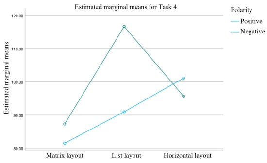 As shown in Table 6, the main effect of information layout on Task 4 completion time was significant (F(2,54) = 5.437, p = 0.007 < 0.05, η2 = 0.168). The matrix layout (M = 84.477 s, SD = 16.023) was 22.7% faster than the list layout (M = 103.805 s, SD = 25.959) and 16.5% faster than the horizontal layout (M = 98.388 s, SD = 17.260). The main effect of display mode was not significant (F(1,54) = 3.066, p = 0.086 > 0.05, η2 = 0.054). As illustrated in Figure 6, a interaction effect was found between information layout and display mode (F(2,54) = 3.383, p = 0.041 < 0.05, η2 = 0.111). Under the list layout, negative polarity took significantly longer (28.1%; M = 116.614 s, SD = 26.024) than positive polarity (M = 90.995 s, SD = 19.512). Conversely, under the horizontal layout, negative polarity (M = 95.669 s, SD = 11.355) was slightly faster (5.7%) than positive polarity (M = 101.106 s, SD = 21.989). This contrast suggests that high-contrast negative polarity exacerbates visual fatigue in vertically scrolling long lists (list layout), whereas the horizontal arrangement (horizontal layout) complements the local high contrast of negative polarity, enhancing information comparison efficiency. This finding supports Cognitive Load Theory, optimizing the match between layout and display mode can reduce working memory burden.