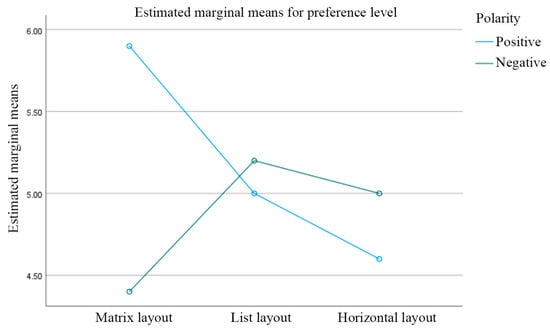 As shown in Table 8, the main effects of information layout (F(2,54) = 0.488, p = 0.617 > 0.05, η2 = 0.018) and display mode (F(1,54) = 0.919, p = 0.342 > 0.05, η2 = 0.017) on preference were not significant. As shown in Figure 7, a significant interaction effect was found (F(2,54) = 3.711, p = 0.031 < 0.05, η2 = 0.121). Under the matrix layout, preference for positive polarity (M = 5.90, SD = 0.876) was significantly higher than for negative polarity (M = 4.40, SD = 1.265). Conversely, under the list layout, preference was slightly higher for negative polarity (M = 5.00, SD = 0.817) than for positive polarity (M = 5.20, SD = 1.476), though this difference was not statistically significant in the simple effects analysis implied by the interaction.