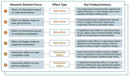 A significant interaction effect was observed between information layout and display mode concerning user preference. This answers the sixth research question: The interaction between information layout and the visual design of auxiliary instructions has a significant effect on participants’ subjective evaluations. Under the matrix layout, user preference for positive polarity was significantly higher than for negative polarity. This stems from the grid structure requiring frequent text reading, where white-on-black maintains visual parsing stability. Under the list layout, user preference for negative polarity was slightly higher than for positive polarity, as strong visual separation between vertically arranged items is needed, and the dark background enhances item discrimination through increased contrast. No interaction effect emerged under the horizontal layout because the sliding operation dominated cognitive resources, masking the differences between display modes under the load of motor actions. A summary of the main research questions and corresponding empirical findings is provided in Figure 8.