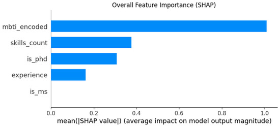 The SHAP (Shapley Additive Explanations) summary plot is essential for explaining how a model makes its decisions. It provides a visual summary of the features that have the greatest impact on the model’s predictions. The length of each bar indicates the average magnitude of the feature’s impact on the model’s output across the entire dataset. A longer bar means the feature is, on average, more important for predicting candidate suitability. The figure illustrates the following insights: