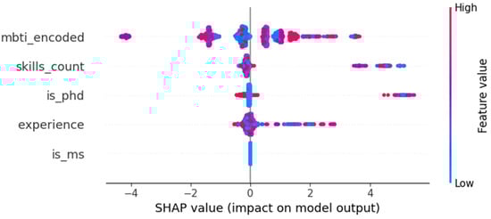 - MBTI Type (mbti_encoded): shows the highest variability in SHAP values, indicating that personality type significantly influences suitability predictions.