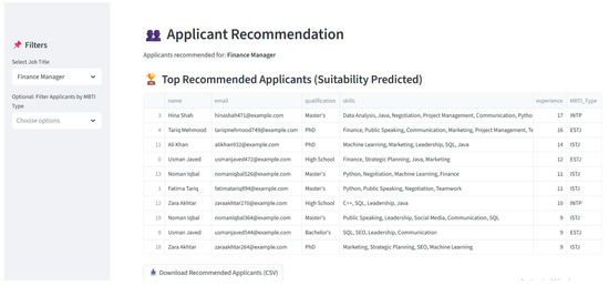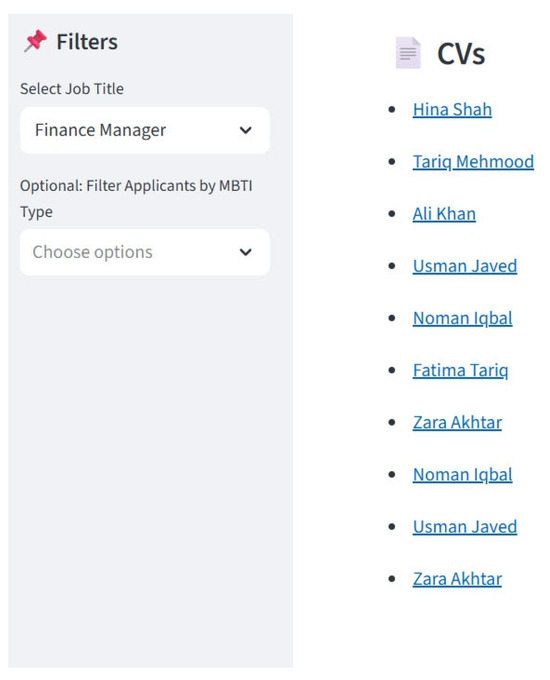 To illustrate the system’s functionality and maintain privacy, the names, email addresses, and other personal data presented in Figure 10 and Figure 11 are fabricated and do not correspond to real individuals. Based on the input features, including qualifications, experience, skills, and MBTI indicators, the model generated a ranked list of the top 10 most suitable applicants. This filtered output was presented through an interactive dashboard, as shown in Figure 10, which highlights key applicant attributes and suitability scores. Additionally, the system provided direct access to the CVs of the shortlisted candidates, enabling HR professionals to conduct a more informed and efficient review process, as illustrated in Figure 11.