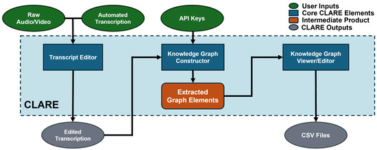 Together, these limitations reveal a gap in the current landscape. Existing approaches either focus on non-verbal content, rely on rigid offline pipelines, or restrict accessibility due to proprietary constraints. None offer an integrated, interactive environment that combines human-in-the-loop transcript correction with real-time, automated KG generation. CLARE addresses this need by tightly coupling a transcript editor with downstream graph construction, visualization, and editing, facilitating an efficient and privacy-conscious workflow.