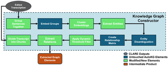 CLARE introduces a unified system for transcript-based KG construction composed of three modular, interoperable components. These are time-synchronized transcript correction, customizable KG construction, and interactive graph editing. Our primary contribution lies in extending AutoKG with a context-aware pipeline that transforms corrected transcripts into semantically labeled triples. We therefore begin by describing the KG construction process in detail. Afterward, we discuss the supporting components for transcript correction and graph refinement, which together enable seamless workflows for domain experts.