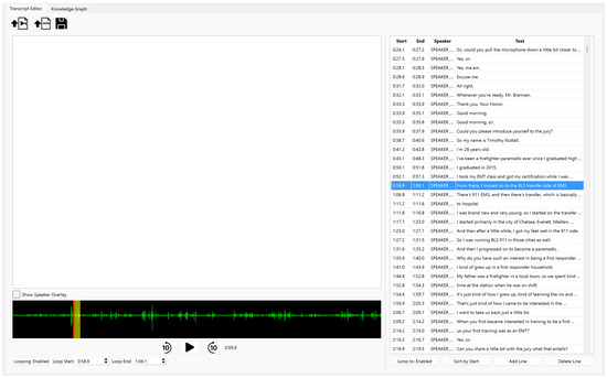 Building on recent progress in transcription and diarization, a growing set of tools now combine both capabilities in accessible, end-to-end workflows. Among open-source options, aTrain stands out as a research-focused solution that integrates transcription and speaker labeling into a pipeline that runs entirely on local hardware. It uses Whisper for transcription and PyAnnote for diarization, and runs entirely on the user’s central processing unit (CPU) or graphics processing unit (GPU) after a one-time model download. By keeping the processing local, aTrain is especially useful for GDPR-sensitive projects or institutional research [7,8]. However, it does not provide users with a way to edit the generated transcripts or construct a KG from them, so additional tools are needed to support correction and structured analysis in downstream applications.