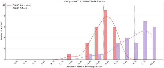 To evaluate the GUI’s effectiveness in supporting users to view, filter, and refine automatically generated KGs, we conducted an additional experiment. We selected the twenty-five lowest-performing KGs produced by CLARE and allocated fifteen minutes to improve each one. During this process, we were shown the facts each graph had missed in the original MINE evaluation and were free to add new nodes and relations or revise existing ones. The only constraint was that any newly created triples had to incorporate at least one existing node from the graph. After refinement, we reevaluated the graphs using MINE and compared the results. As shown in Figure 7, even these short interventions produced considerable gains, with the average KG’s fact accuracy increasing by 22.67%.