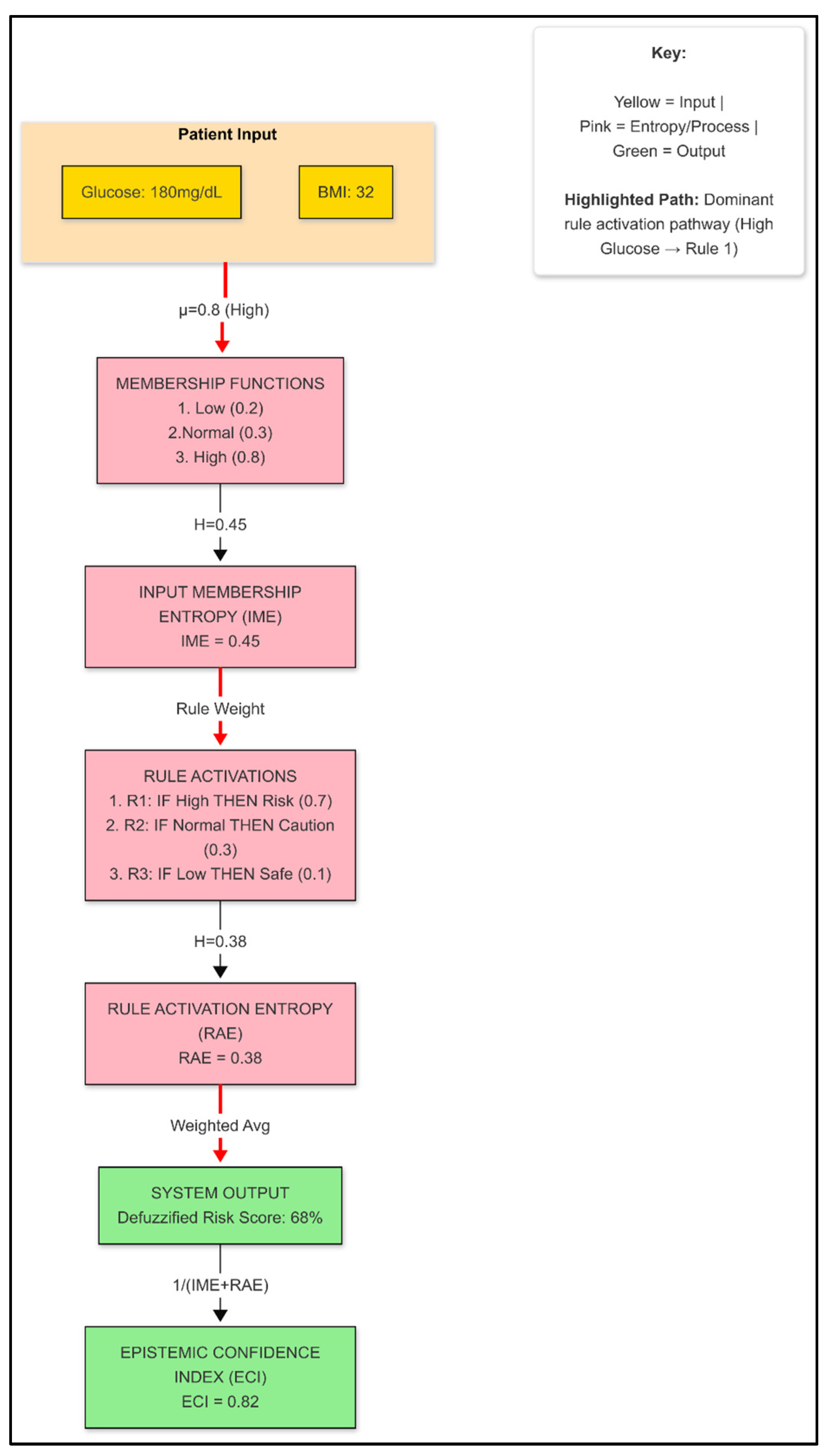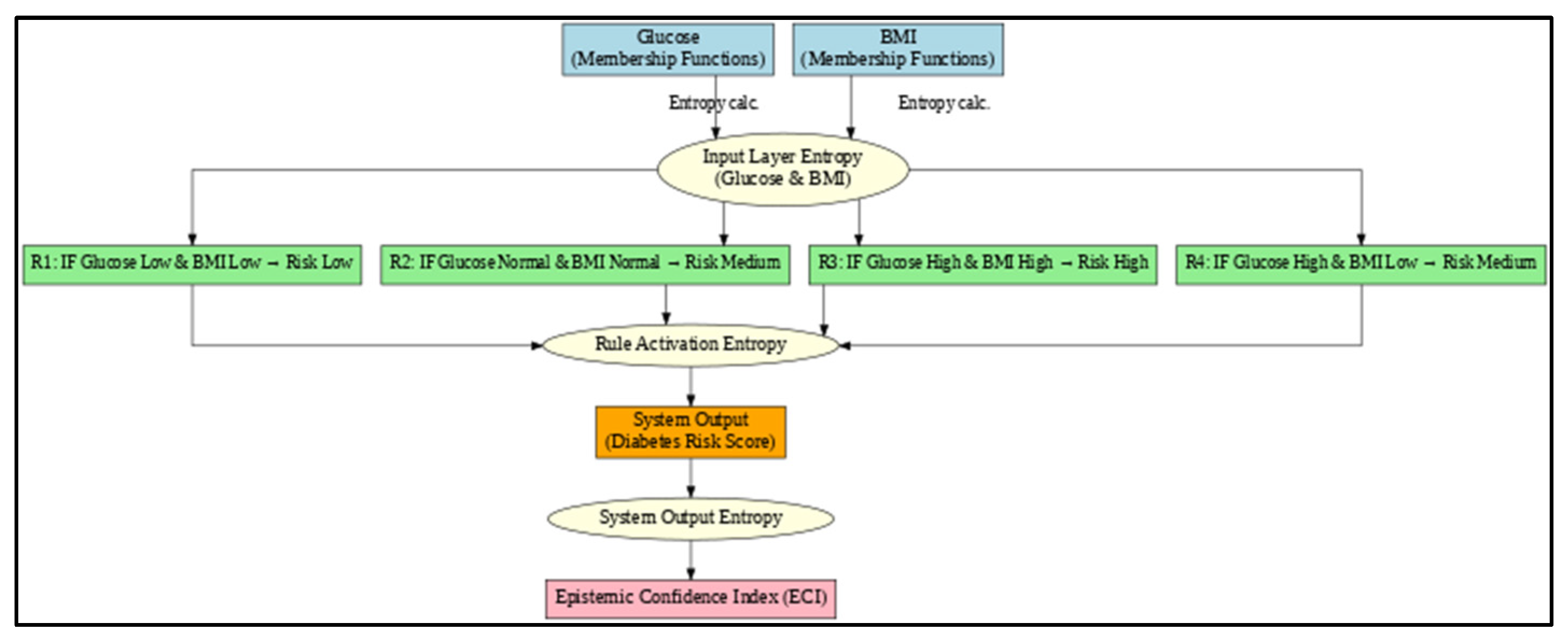Input Layer | BMI Membership Entropy | 0.1843 | Slight membership uncertainty in BMI |
