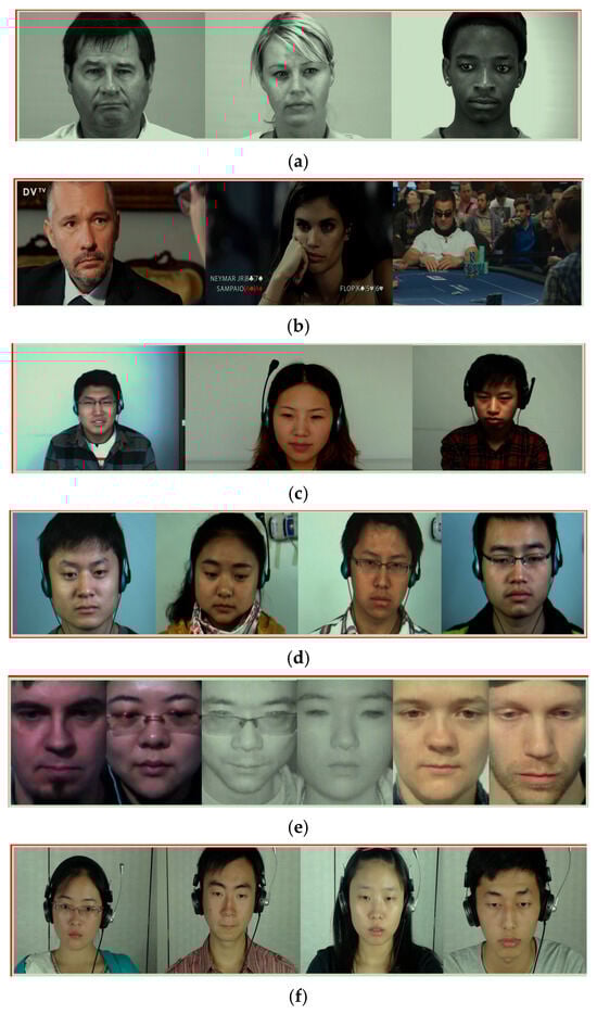 In the study of automatic micro-expression recognition, the quality, scale, and diversity of the dataset are important factors that determine the performance of the algorithm and the generalizability of the research results. Micro-expressions usually last for a very short time, generally between 1/25 s and 1/3 s, and are accompanied by very small facial muscle movements, which makes their collection in a natural environment extremely challenging. Compared with regular facial expressions, micro-expressions have higher requirements in terms of temporal and spatial resolution, requiring the use of high-frame rate cameras (such as 100 fps and above) for video collection, and high-precision facial movement analysis tools. Figure 3 is an example of SMIC [30], CASME [31], CASME II [15], SAMM [17], CAS(ME)2 [32] and MMEW [8] micro-expression datasets.