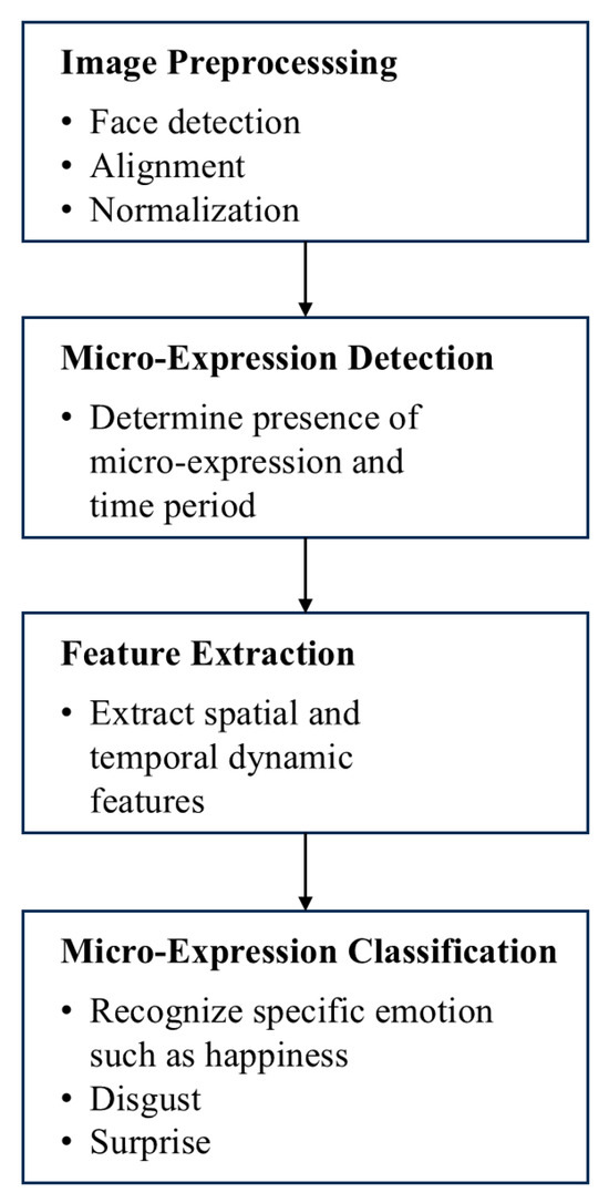 As shown in Figure 4, micro-expression recognition usually includes four key stages: image preprocessing, micro-expression detection, feature extraction, and micro-expression classification.