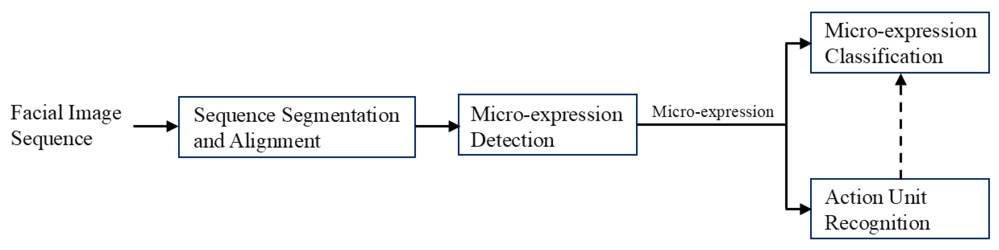 - Ben, X.; Ren, Y.; Zhang, J.; Wang, S.-J.; Kpalma, K.; Meng, W.; Liu, Y.-J. Video-based facial micro-expression analysis: A survey of datasets, features and algorithms. IEEE Trans. Pattern Anal. Mach. Intell. 2021, 44, 5826–5846. [Google Scholar] [CrossRef] [PubMed]