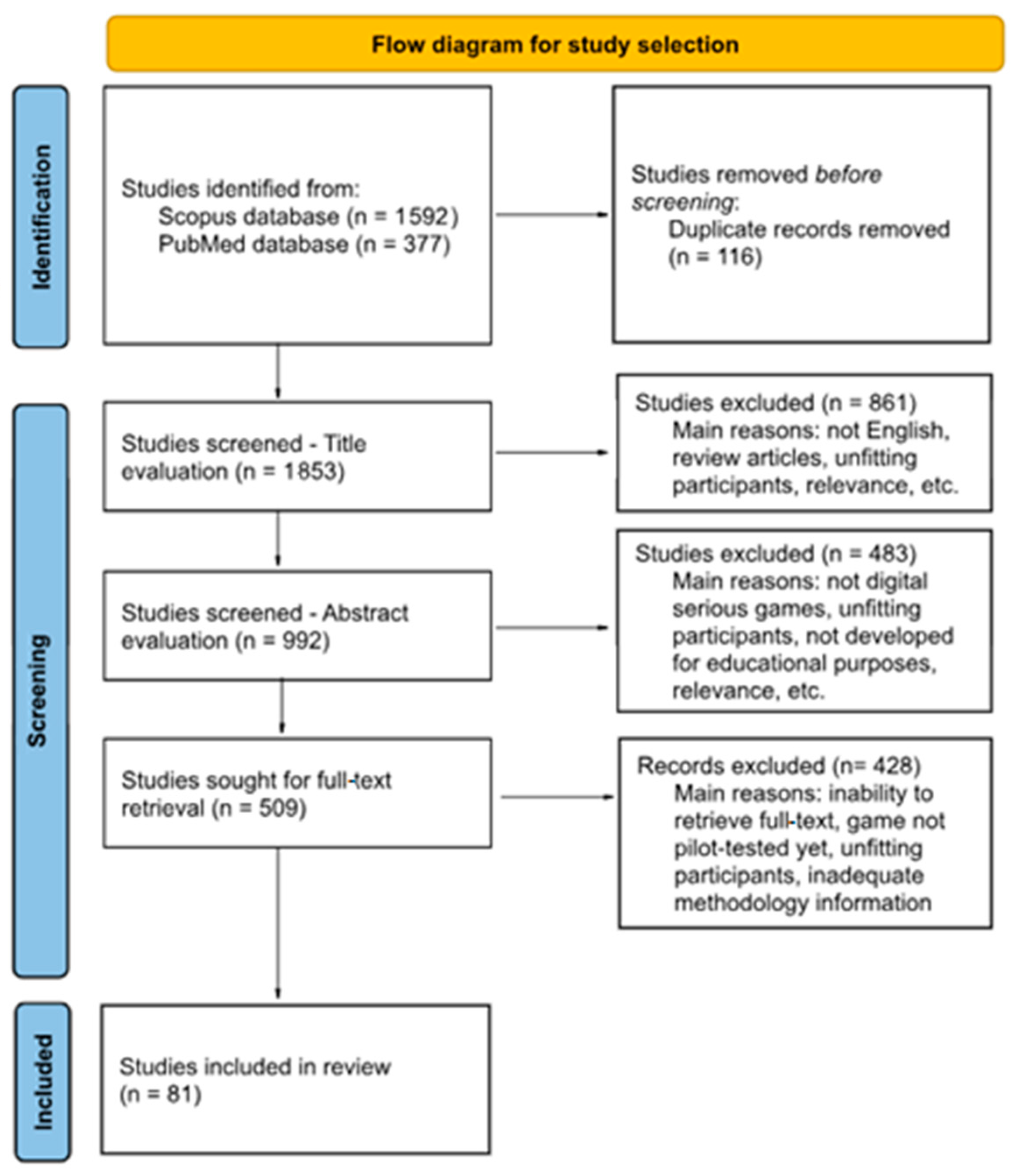 Among the inclusion criteria were studies published between 2019 and 2023; studies in English; studies involving only/primarily undergraduate nursing students; and studies focusing on digital serious games for undergraduate nursing education. Among the exclusion criteria were studies implemented in healthcare students of other disciplines; studies involving nurses and/or other healthcare professionals; studies including nursing students but implementing serious games not designed for undergraduate nursing education; studies on the design of serious games that have not yet been implemented in classrooms; and studies that could not be accessed in full-text form.