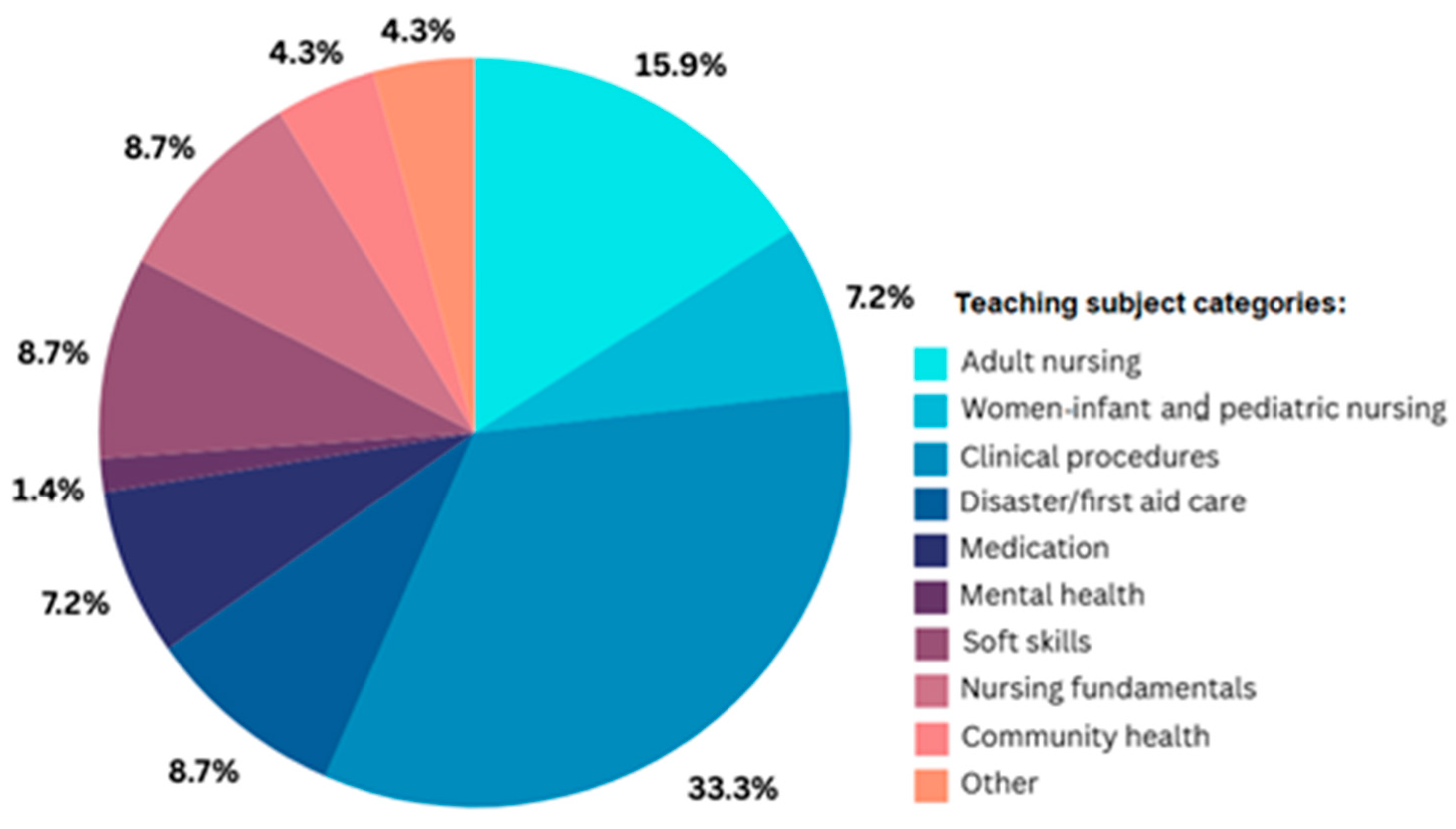 For Q2.3, we classified serious games subjects into ten broad groups (Figure 2). The most common subject was “nursing clinical procedures and clinical practice skills” (33.3%), followed by “adult nursing care provision” (15.9%). Table A5 in the Appendix A presents all serious games teaching topics categorized by thematic group. Most articles (52.2%) did not report if the games were introduced within a specific curriculum course. Hence, to answer Q2.4, data was extracted from 33 articles (47.8%), and six categories similar to the teaching topic groups were formulated (Table 3). As observed, most games were part of nursing fundamental courses (n = 11) or nursing clinical procedures–practices (n = 7).