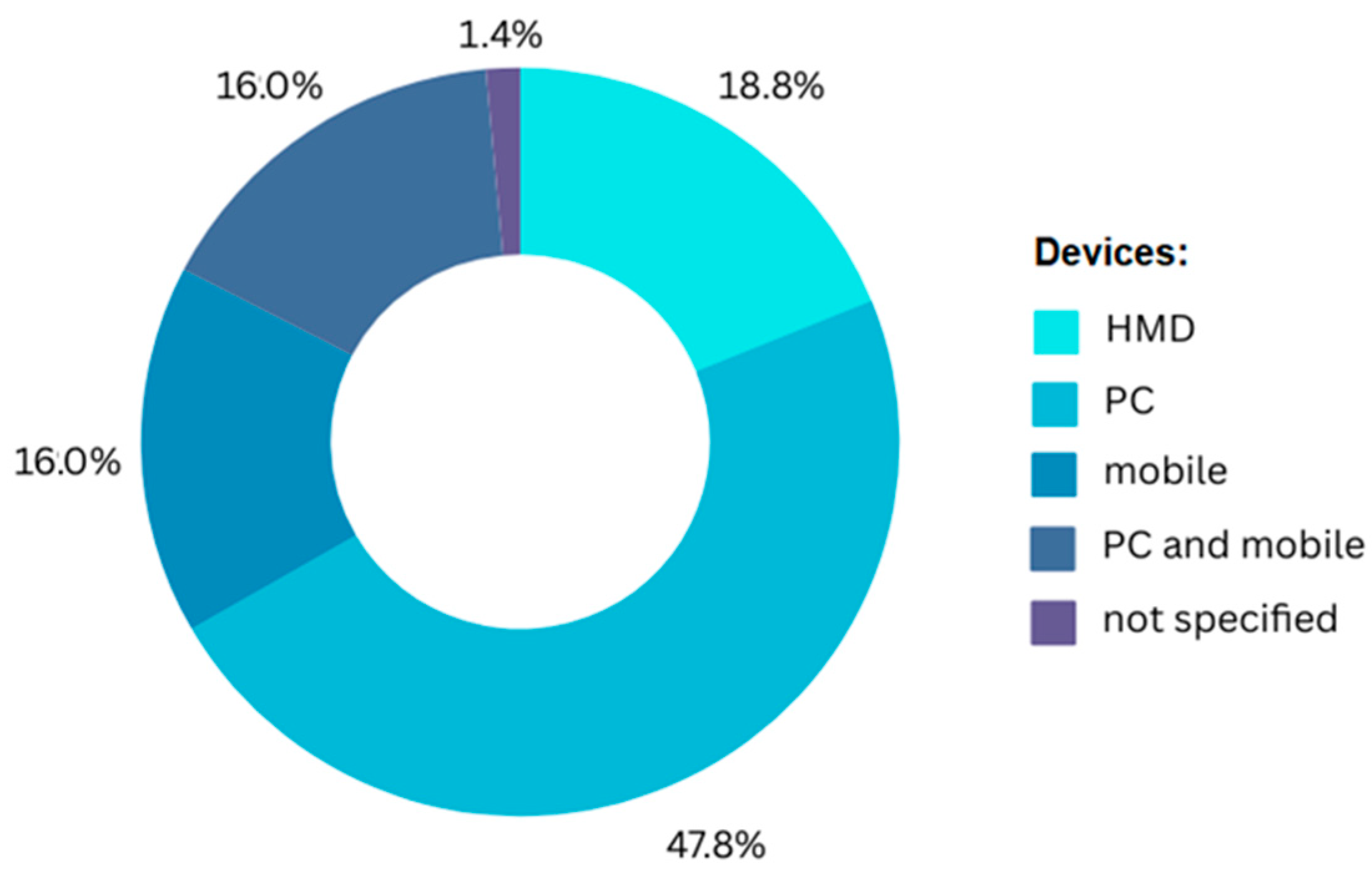 To answer Q3.1, we analyzed all the data we could extract on serious game design information. Firstly, we investigated the different devices that serious games were developed for. According to the results, the following categories were created: (1) games developed for personal computers (PCs), (2) games designed for Head-Mounted Display (HMD) devices (including stand-alone HMDs, PC-HMDs, or mobile-HMD devices), (3) games created for mobile devices (including iPods, tablets, and mobile phones), and (4) games that were designed for both PC and mobile device use. For one publication, we could not extract the necessary info, therefore the category (5) “not specified” was added. Figure 3 presents findings per device category. Almost half of the nursing games (47.8%) were designed as PC serious games.