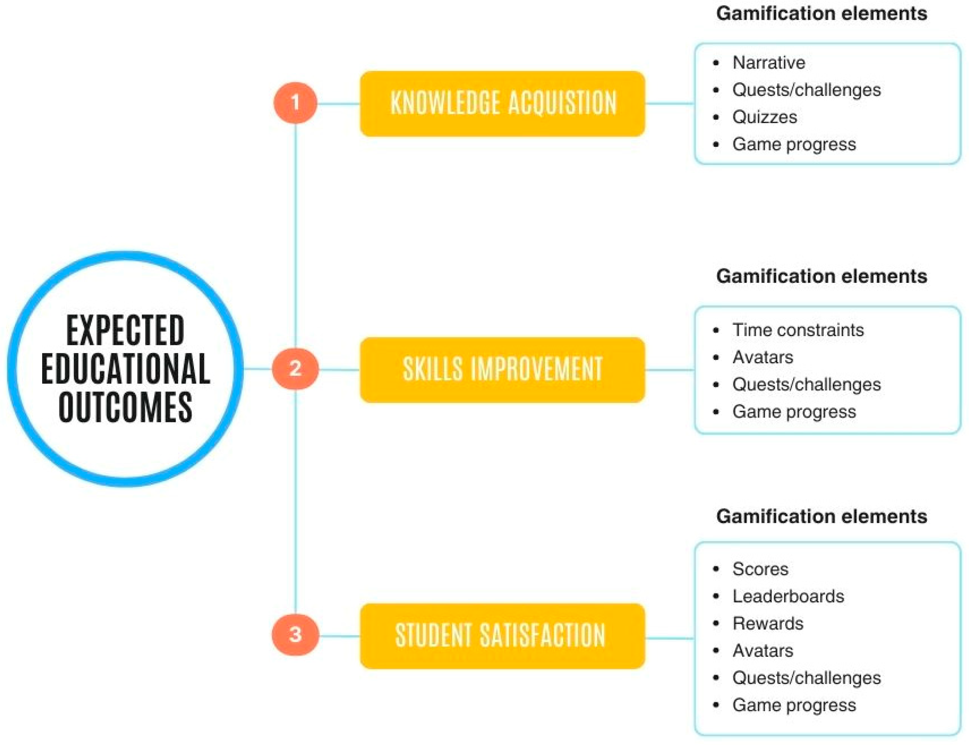 In addition, to further support the interpretation of the above findings, we propose a conceptual framework illustrating the potential connection between the emerged gamification elements and their contribution to key educational outcomes. The outcomes include cognitive domain (knowledge acquisition), psychomotor domain (skill development), and affective domain (learner satisfaction). Figure 6 provides a visual representation of how we perceive which specific game-based features influence different dimensions of learning.