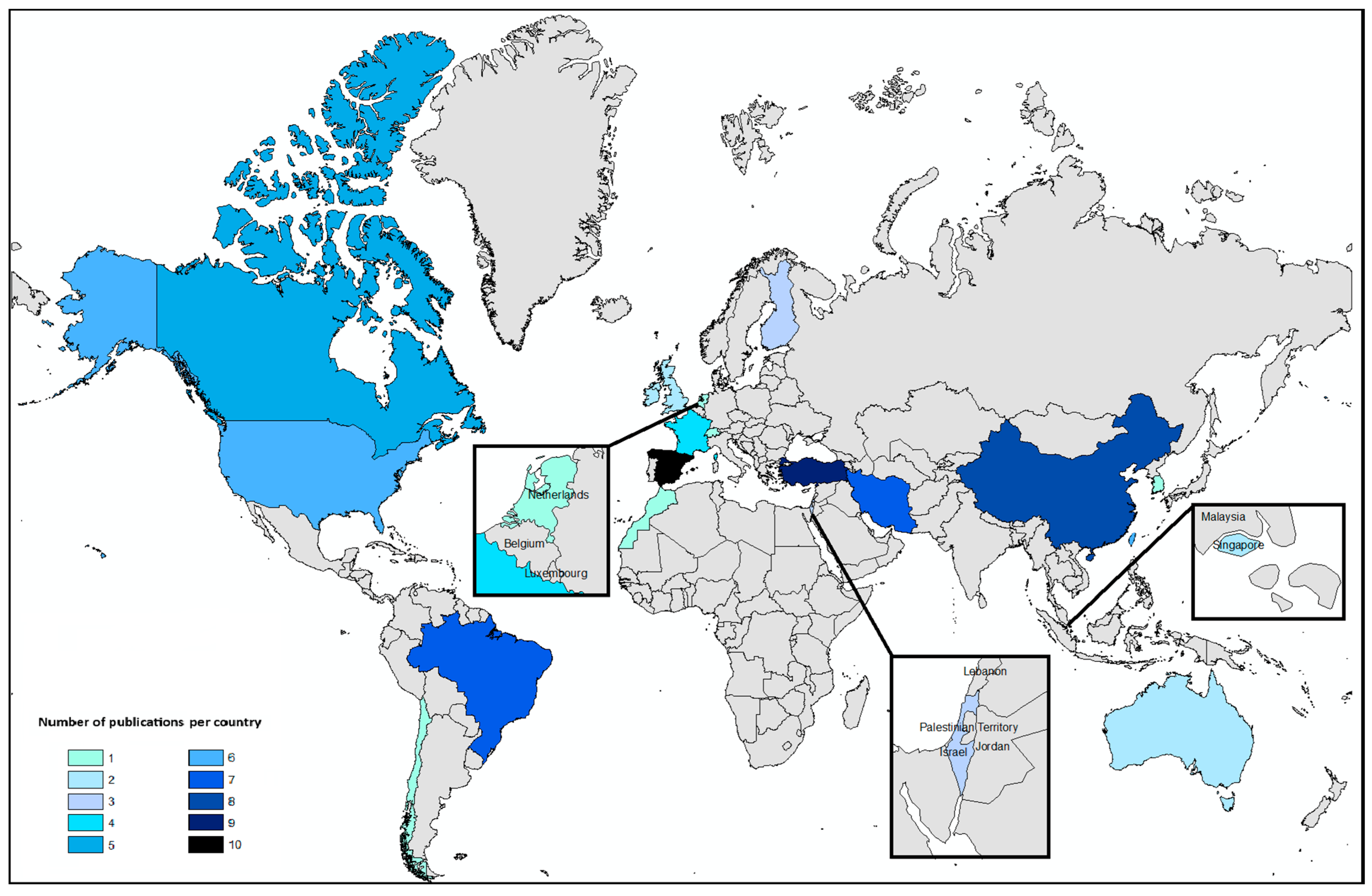 The first research question (Q1.1), was addressed through the presentation of the 81 articles in Table 1. The geographical distribution of publications (Q1.2) can be observed on the map in Appendix A (Figure A2). Overall, twenty countries from all five continents were identified. The countries with the most publications were Spain (n = 10), Turkey (n = 9), and China (n = 8). A thorough analysis of the exact number of articles each country yielded is available in the Appendix (Table A3).