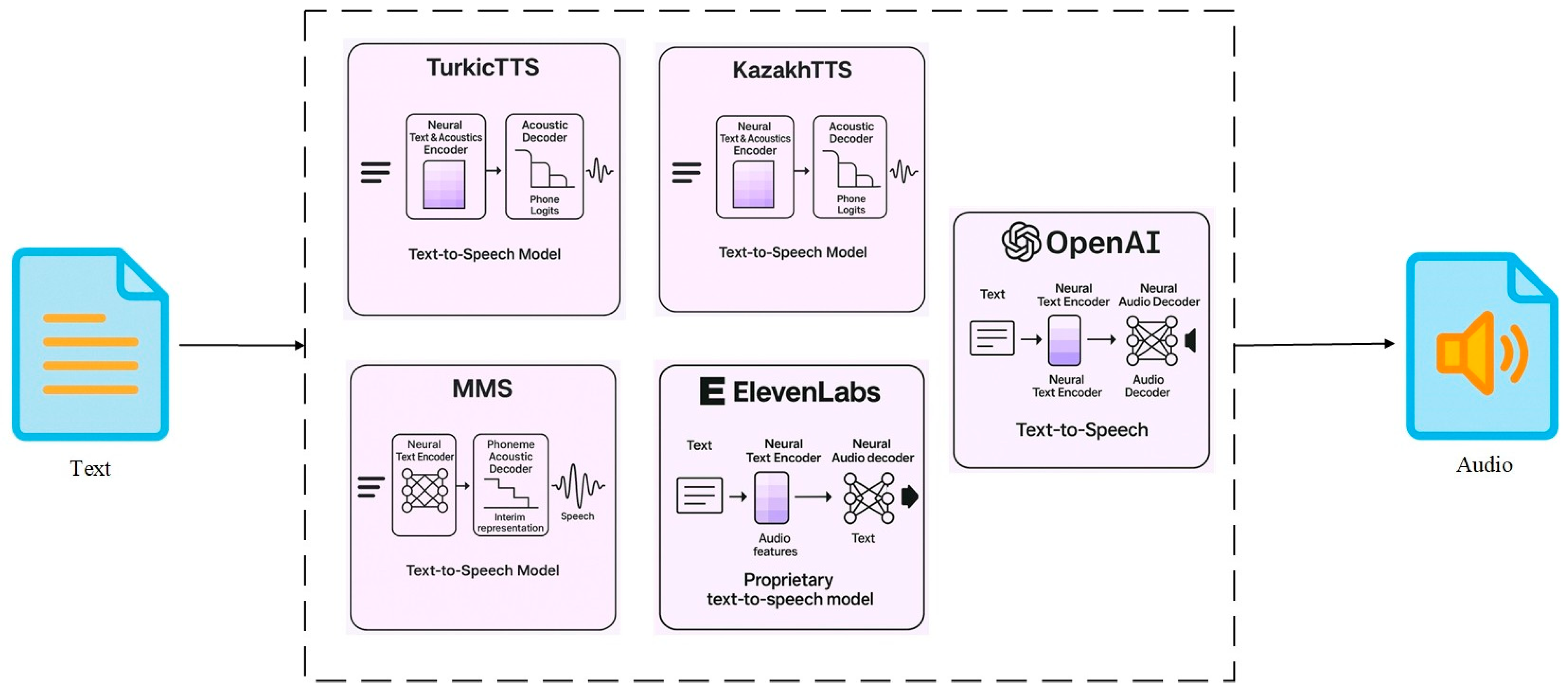 OpenAI TTS | Advanced expressiveness Integrated with GPT models for contextual adaptation Robust handling of pauses, emphasis, and emotion Multilingual support, including Kazakh | Closed-source and API-only Limited user customization Subject to quotas and usage caps |