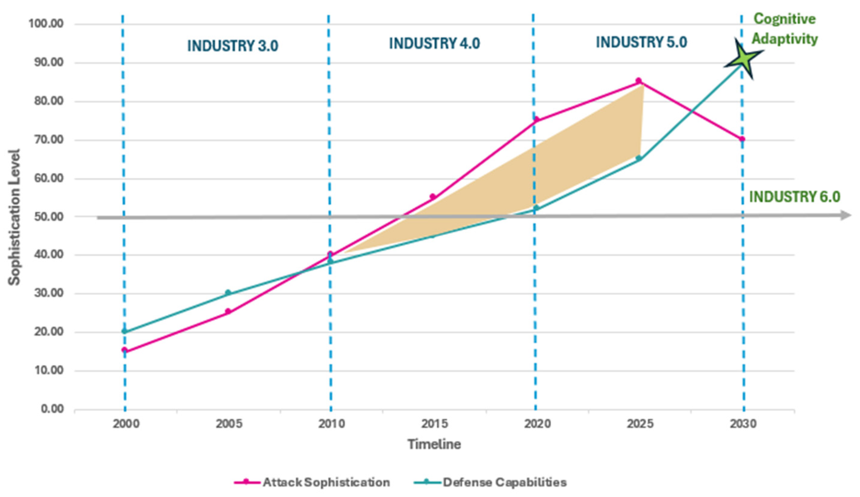 | Industry 6.0 (2025+) | Deepfakes, cognitive manipulation, autonomous attack systems, learning system poisoning. | Symbiotic dependencies, cognitive adaptation exploitation. | Cognitive adaptivity frameworks. | 20–30 |
