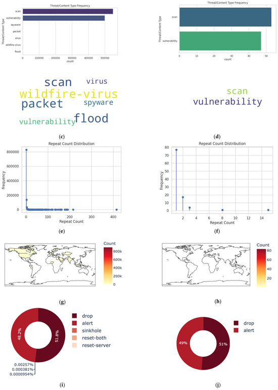 Some important feature exploration plots with comparison between the entire dataset (left) and 100 randomly selected datapoints (right). (a) Data visualization for the whole dataset. (b) Data visualization for 100 datapoints. (c) Data visualization for the whole dataset—Time-Logged. (d) Data visualization for 100 datapoints—Time-Logged. (e) Threat/Content Type for the whole dataset. (f) Threat/Content Type for 100 datapoints. (g) Repeat count type for the whole dataset. (h) Repeat count type for the 100 datapoints. (i) Distribution type for the whole dataset. (j) Distribution type for the 100 datapoints.