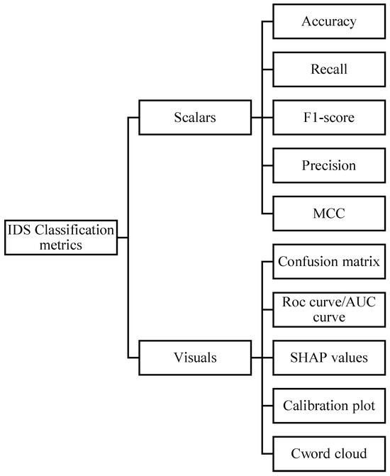 Figure 4 offers a typical classification metric layout showing the classification of measure categories, and it is based on a metric’s representation. An IDS classification system was performed by using one or more sets from the classification measures summarized below [22].