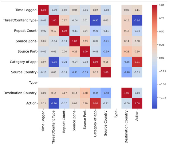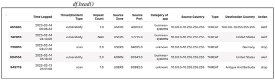 For illustrative purposes, this section will use a small randomly selected sample of 100 datapoints from the main dataset. The analysis will focus on 10 features relevant to intrusion detection: “Time-Logged”, “Threat/Content Type”, “Repeat Count”, “Source Zone”, “Source Port”, “Category of App”, “Source Country”, “Type”, “Destination Country”, and “Action”.