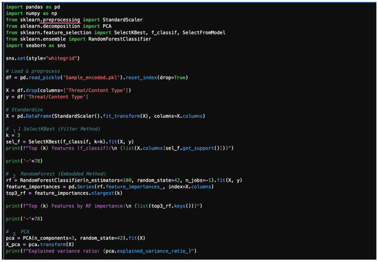 Feature extraction: Methods like Principal Component Analysis (PCA) transform the original features into a smaller set of new, uncorrelated components that preserve most of the original data’s variance. A typical dimensionality reduction sample code is given in Figure 40, and this code is followed by its plot in Figure 41, offering an example of dimensionality reduction output.