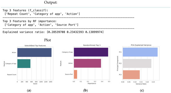 An example of dimensionality reduction output. (a) Filtering using selectKbest. (b) Feature importance using Random Forest. (c) PCA.