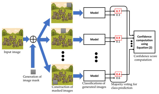 - Majority voting for class prediction. Initially, let for . For each prediction, let the predicted class be . we then update the vote count such that . The final class label for the original image I is determined by majority vote as .
