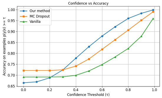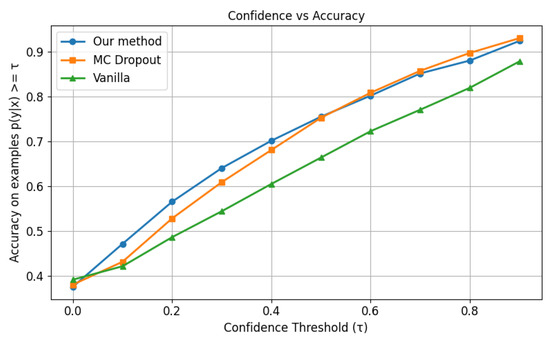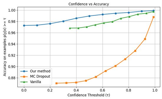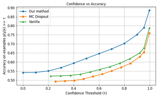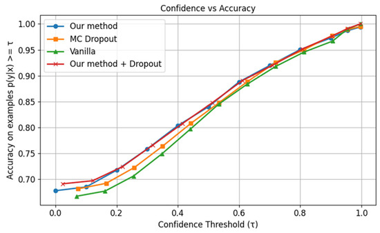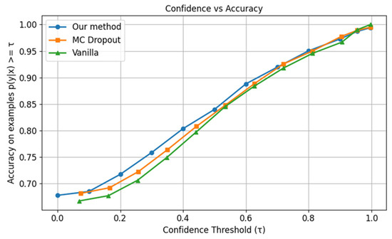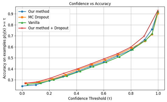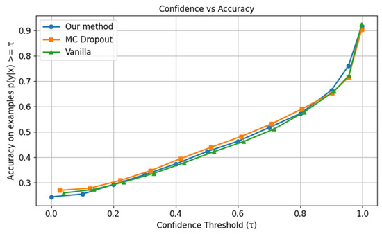 where is the total number of test samples, is an indicator function returning 1 if the condition holds and 0 otherwise, is the model’s predicted probability for the true class given input , and is the predicted class label for sample . In the actual implementation of multi-class classification scenarios, is the softmax value of the true class , i.e., . In our experimental analysis, we focus on the high-confidence region of the accuracy–confidence curve to assess model reliability. For a given confidence score, a higher corresponding accuracy indicates stronger predictive calibration and is therefore preferable.