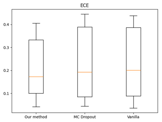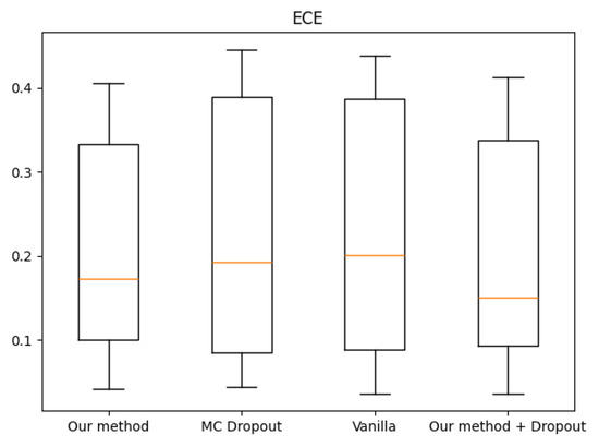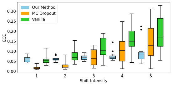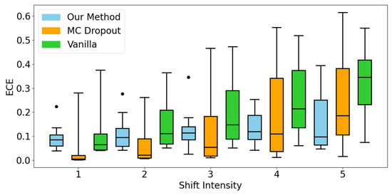Further evidence is provided in Figure 20, which presents the ECE results for level-3 distortion. The ensemble method yields a lower median error and narrower distribution intervals, highlighting its ability to maintain robust uncertainty quantification even under significant image degradation. These findings affirm the practical value of integrating the proposed method with MC dropout to enhance reliability and performance in challenging visual environments.