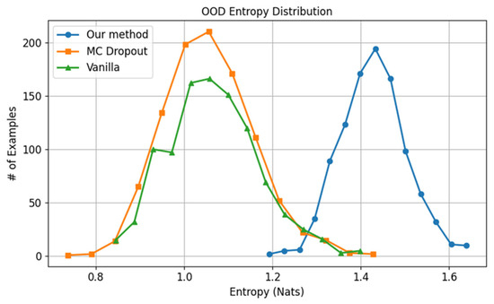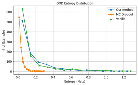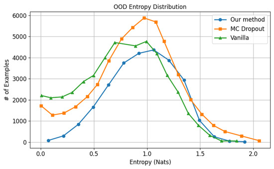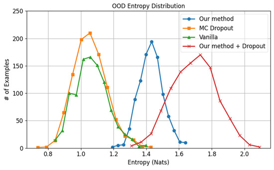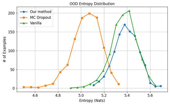For OOD samples, where ground-truth labels are unavailable, entropy is adopted as the evaluation criterion. For the same reason as in Brier score and NLL, we choose to apply it to softmax outputs derived from steps 1–3 of our approach to maintain a fair basis for comparison with other methods.