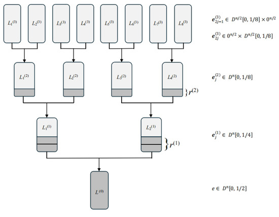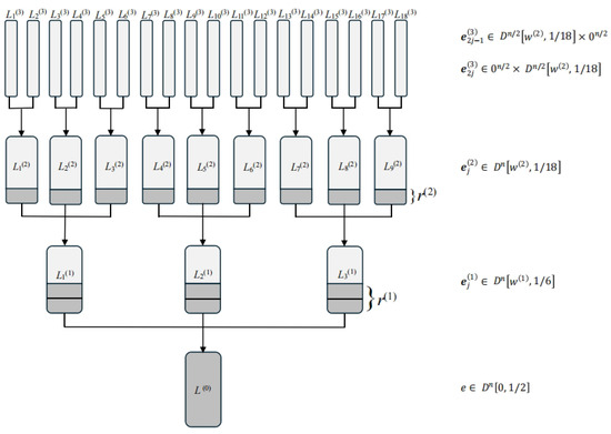 A significant heuristic algorithm was proposed by Howgrave-Graham and Joux (HGJ) [18] at EUROCRYPT 2010, solving the RSSP with a time complexity of and a space complexity of , thus breaking the long-standing barrier. Their key innovation was the use of the representation technique, in which the solution is expressed ambiguously as a sum of vectors in . This expands the size of the search space and enables the merging of more lists under arbitrary constraints, leading to improved time efficiency. The time and space complexity is derived via numerical optimization, under the standard heuristic assumption that the individual elements obtained in the merging steps are well-distributed. Becker, Coron, and Joux (BCJ) [19] subsequently reduced the time and space complexity to by introducing representations using vectors from . Later, Bonnetain, Bricout, Schrottenloher, and Shen (BBSS) [20] further reduced the time and space complexity to by relaxing BCJ constraints and permitting representations in . Not only has the representation technique been employed as a tool for the subset-sum problem but it has also been successfully applied to the syndrome decoding problem [21,22,23,24] and the learn-with-errors (LWE) problem [25,26,27,28,29].