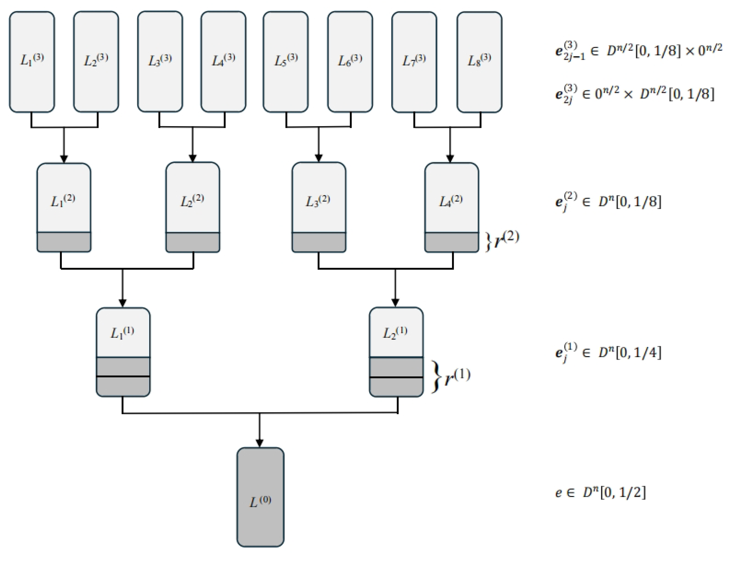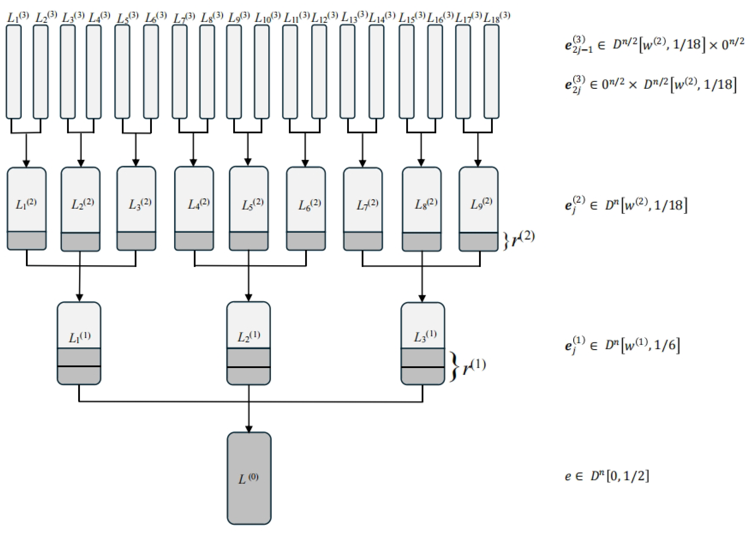 The core idea is to represent  e  ambiguously as a sum of vectors in  { 0 , 1 } n , i.e.,  e = e 1 ( 1 ) + e 2 ( 1 )  with  e 1 ( 1 ) , e 2 ( 1 ) D n 0 , 1 / 4 . We call  ( e 1 ( 1 ) , e 2 ( 1 ) )  a representation of  e . The ambiguity introduces  R ( 1 ) = n / 2 n / 4  representations of  e , since each of the  n / 2  1-coordinates in  e  can be represented as  1 + 0  or  0 + 1 . This paper adopts the notation where a parenthesized superscript corresponds to the depth of a given vector or parameter in the tree.