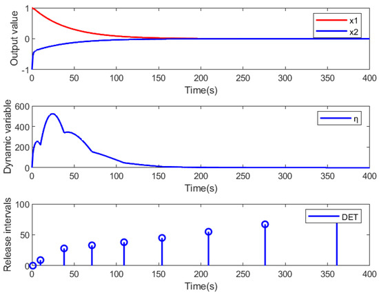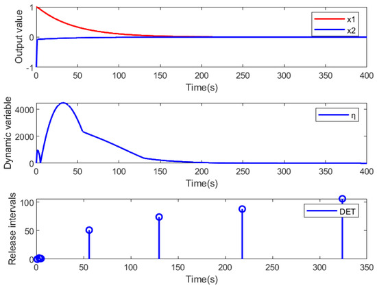 As is well known, when the system has been stable, the dynamic event-triggered scheme would degenerate to the static event-triggered scheme. The advantages of the dynamic event-triggering scheme are more reflected in the transient process of the system. On one hand, from the definition in (10), is the eigenvalue of the dynamic parameter , which represents the convergence rate of . On the other hand, for the discrete system in (1), if the system is n-dimensional and stable, there are n eigenvalues of the closed-loop system. The maximum eigenvalue max() of the discrete system is a special one because it is the slowest to converge to zero. Thus, if we choose (), the dynamic parameter and the discrete system would nearly converge to zero at the same time, which would maximize the effect of dynamic event-triggered strategy.
