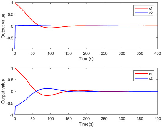 Data can be obtained as . Setting h to . Other conditions are consistent with the system described above. By Theorem 2, one obtains and , and find the state feedback as follows: