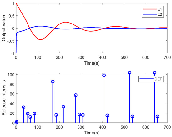 The system state and event−triggering moment of the controller are designed according to Theorem 2 when the time delay is 60.